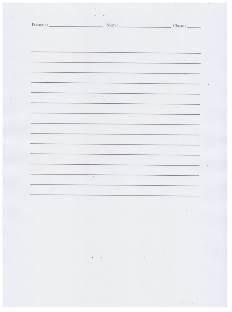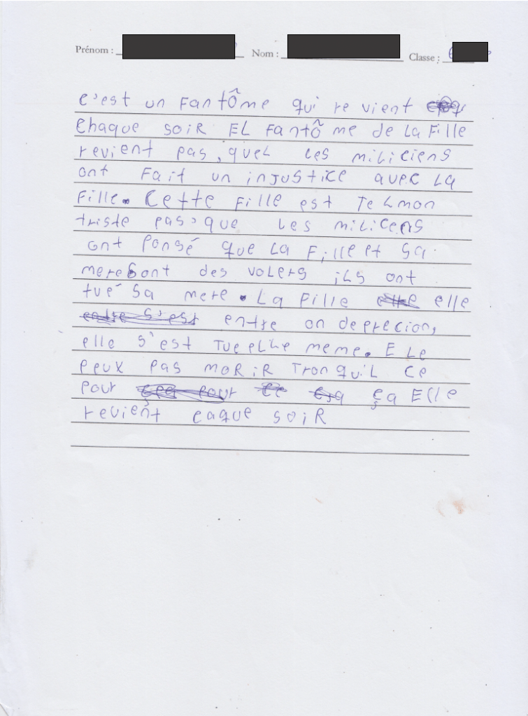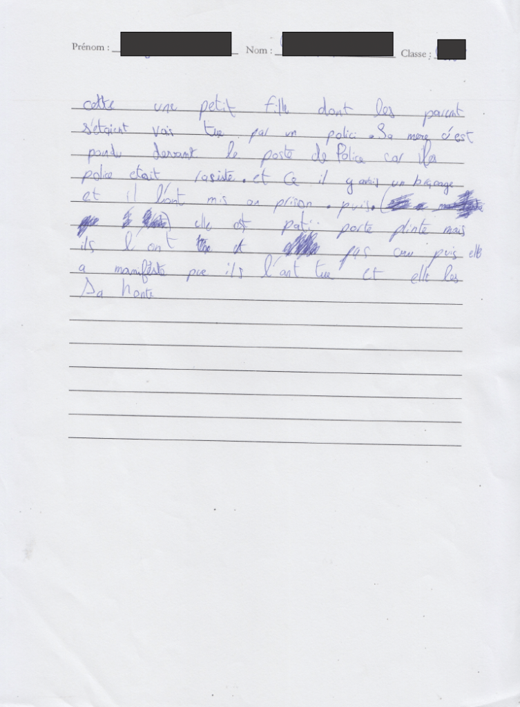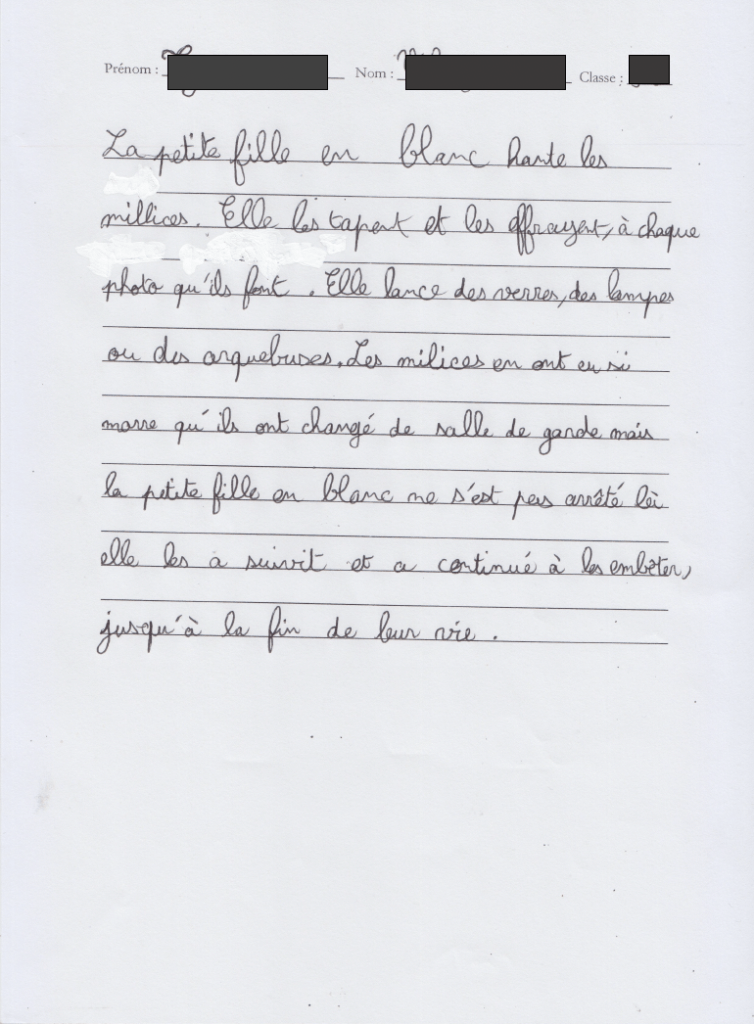 La plupart des élèves racontent peu ou prou la même histoire de meurtre commis par la milice. Avec des mots empâtés de tipex, encroutés de bic noir ou bleu, biffés, raturés. Lignes écrites par des gamin.e.s d’Aubervilliers avec leurs flexions si singulières, quasi idiosyncrasiques, entaillant la syntaxe et l’orthographe, laminant la notion même de langue policée.
