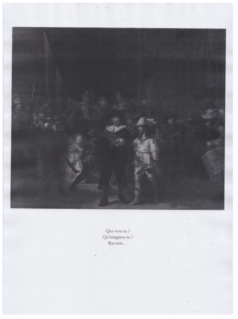 Pour ce qui est d’une pratique, Camille, j’ai opté pour l’exercice le plus banal qui soit à l’école — la rédaction — en écrivant sous la photocopie du tableau : « Que vois-tu ? Qu’imagines-tu ? »