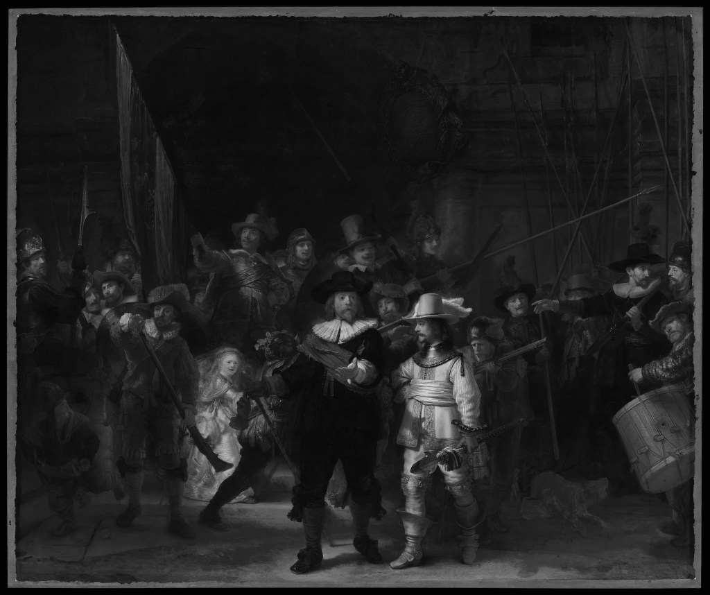 Ce dont ne parle pas une seule seconde l’article du Figaro, c’est de la fillette en robe blanche qui court parmi « la compagnie de gardes du capitaine Frans Banning Cocq ». Cette présence a toujours interrogé les historiens de l’art : une enfant, là, complètement déplacée —, sorte d’étrangère parmi la milice qui parade avec « ses mousquets, ses drapeaux et ses piques. »